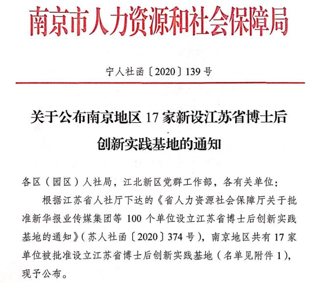 日前,江苏省人力资源和社会保障厅发布通知(苏人社函[2020]374号),南京地区共有17家单位获批设立江苏省博士后创新实践基地,南京yl6776永利集团股...
